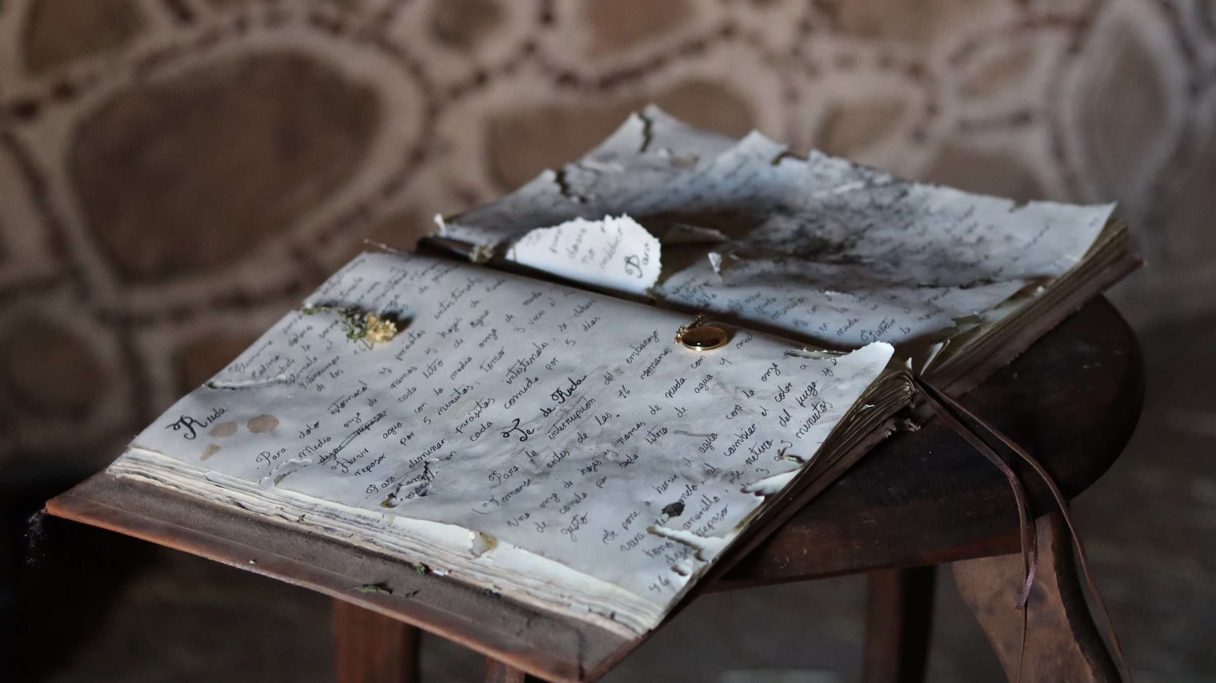 Por la noche, llega a una hacienda abandonada. En la cocina, busca, dentro de muebles en mal estado y corroídos, el recetario de su abuela. Al encontrarlo, pasa las hojas hasta llegar a la receta del Té de ruda; sin embargo, descubre que parte de ésta es ilegible, a causa de la humedad.