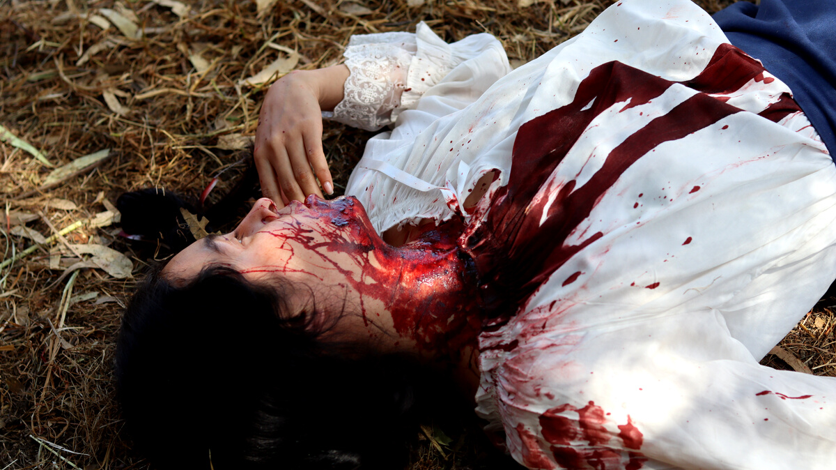En medio de su cabalgata diaria, en busca de alimento, Isabel empieza a sentirse mal. De una de sus piernas baja un hilo de sangre que gotea sobre la tierra. Se debilita hasta perder el control de sus manos. Suelta la rienda, la yegua se detiene e Isabel cae al suelo, desmayada. La falda de su vestido está profusamente manchada de sangre, ella queda tendida bajo el rayo del sol.