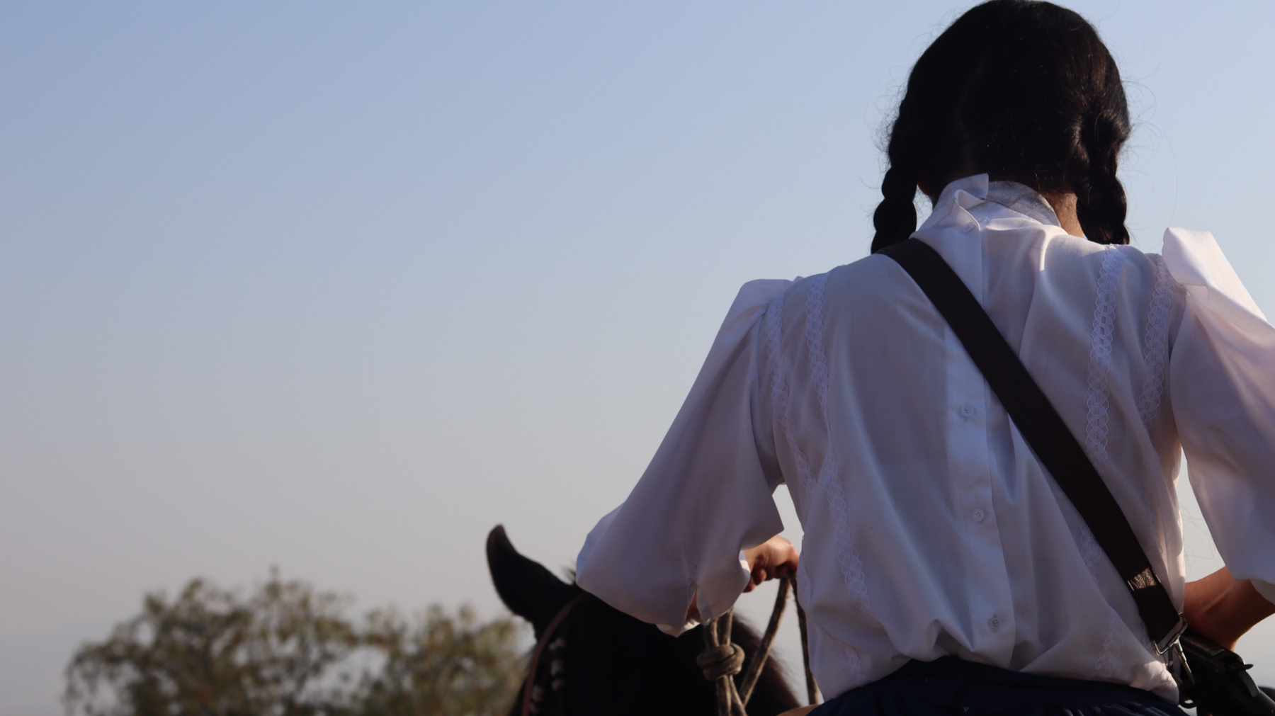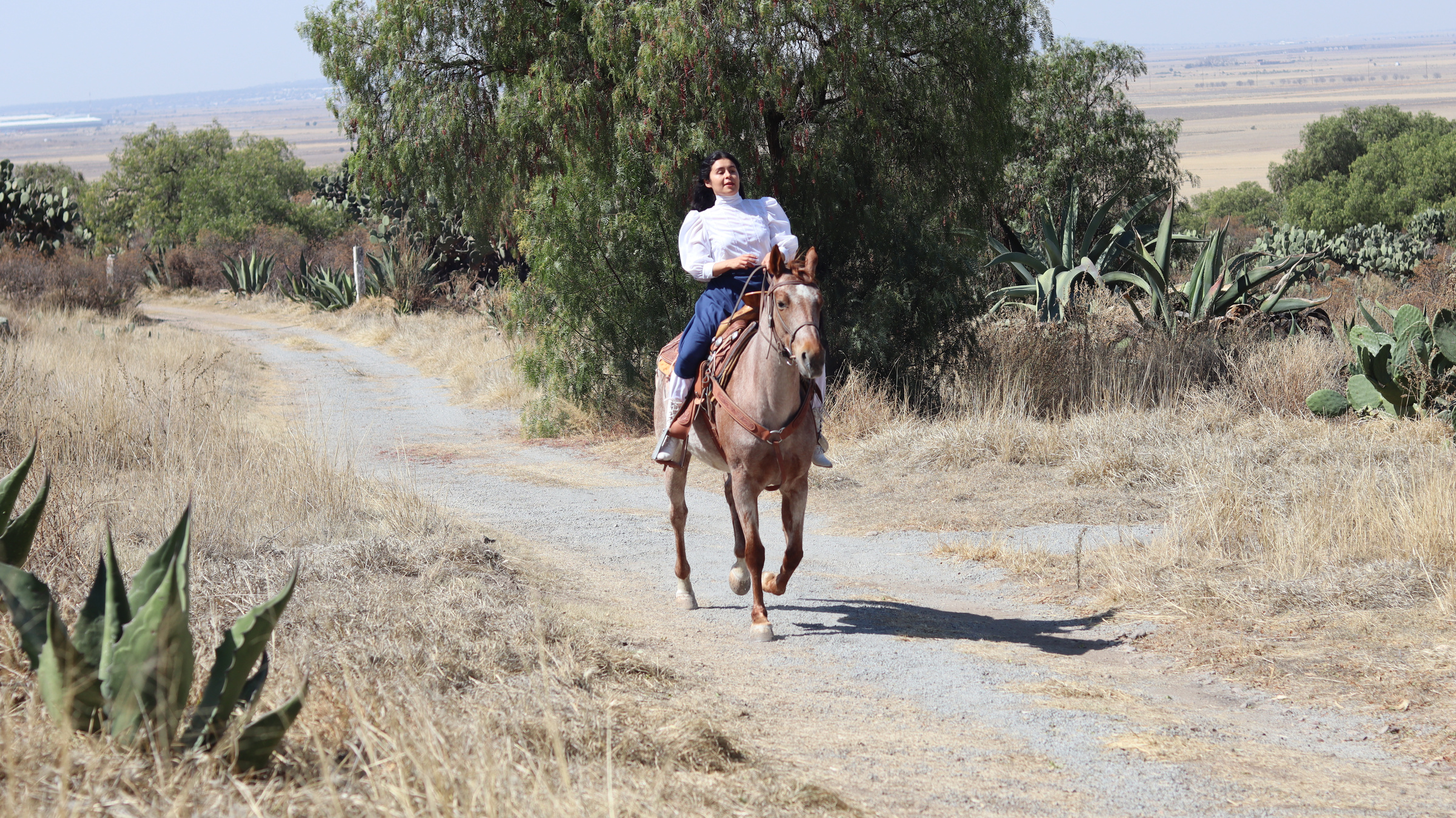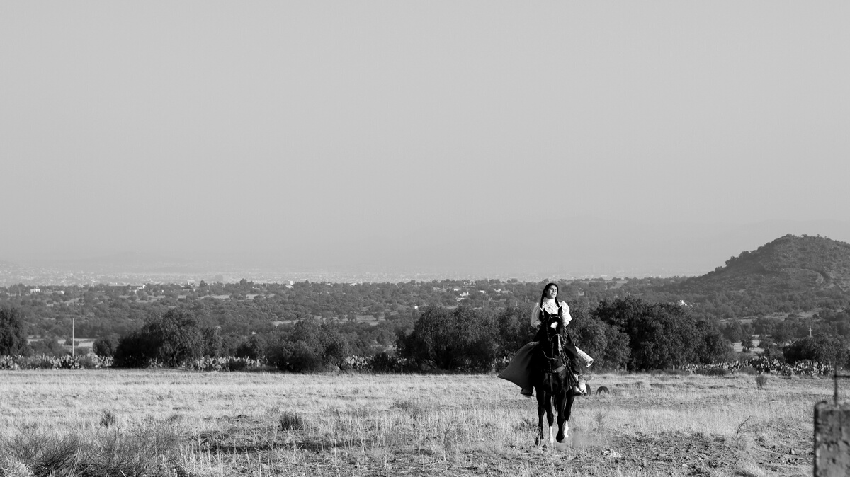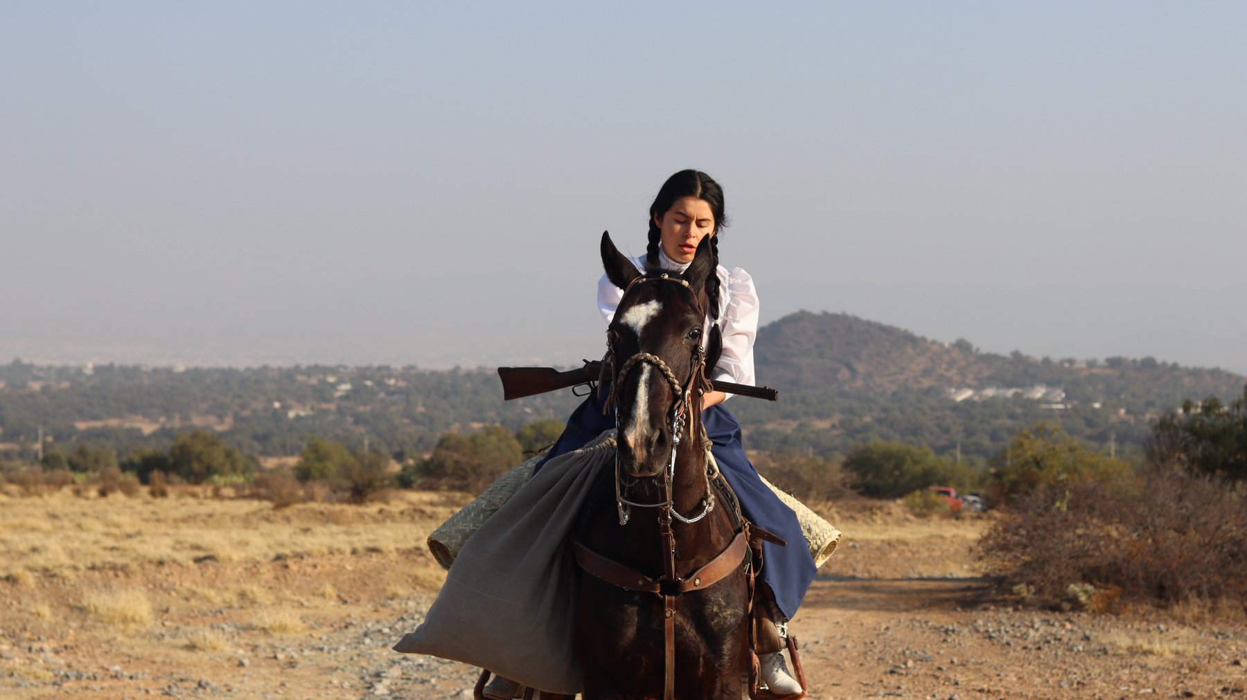 México revolucionario. Isabel, una adolescente rebelde, huye a caballo, a través del semidesierto. Carga con algunos costales y un rifle.