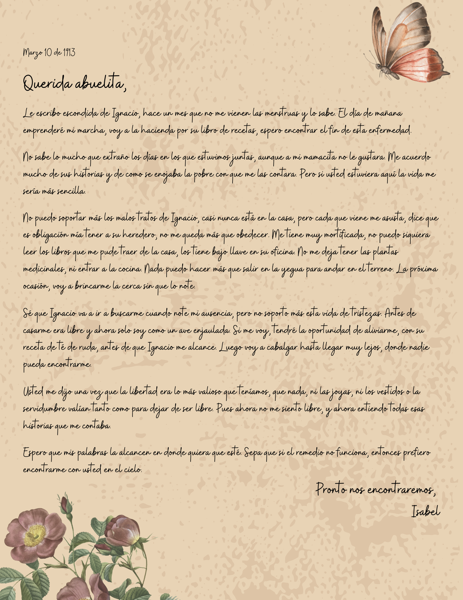 Elegí narrar la historia durante el periodo de la Revolución Mexicana, pensando en que, a pesar de que ha pasado más de un siglo desde entonces, hay situaciones que continuan siendo, lamentablemente, actuales. Por mucho tiempo las mujeres nos hemos protegido entre nosotras, como entes invisibles dentro de una sociedad patriarcal. A Isabel la protege su abuela, con el conocimiento heredado que deja en forma de recetario, la protege de un futuro de supervivencia para poder vivir.